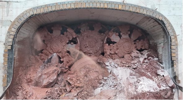 上午11時左右,矩形頂管機的6個“大滾筒”組成的“矩形”刀盤旋轉著向前推進,順利貫通了A匝道隧道工程的最后“一米”。